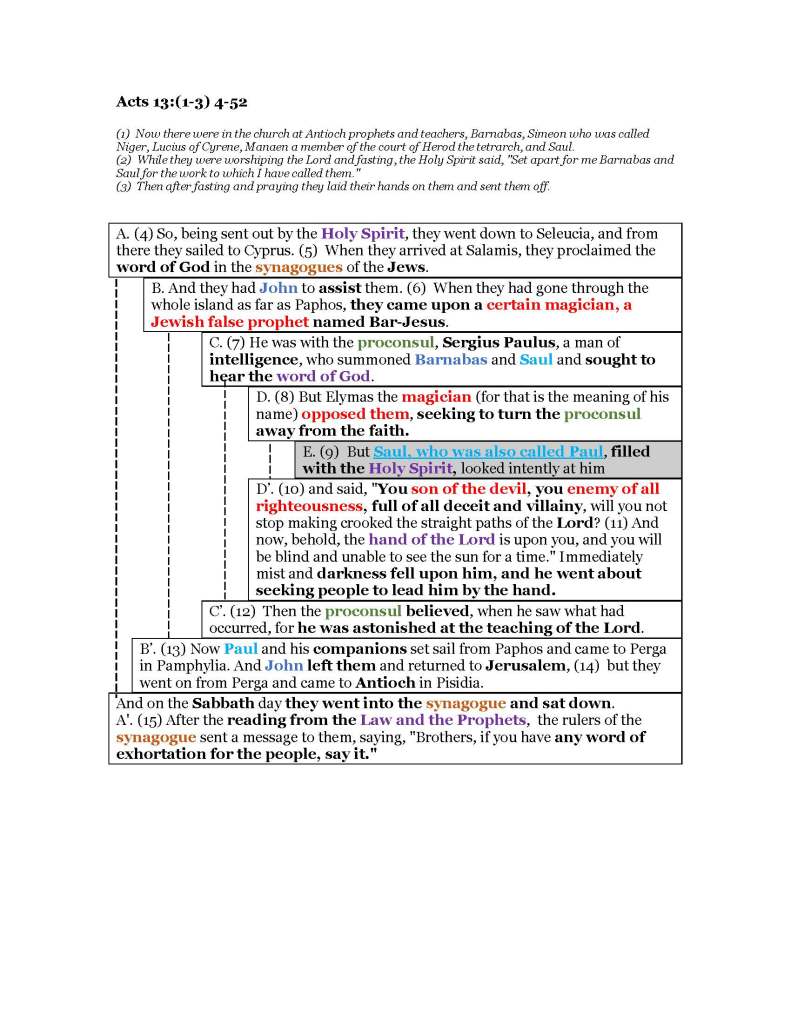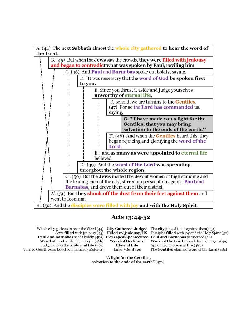 Acts 13 marks a pivotal point in the history of redemption: the expansion of the apostolic mission, commanded by Jesus, to go from the Jews in Jerusalem to the Gentiles around the world (Acts 1:8: “But you will receive power when the Holy Spirit has come upon you, and you will be my witnesses in Jerusalem and in all Judea and Samaria, and to the end of the earth”). The chapter includes (i) Saul’s ordination (13:1-3), (ii) the changing of his name to Paul (13:9), (iii) the story of Paul’s first convert (13:6-12), and (iv) Paul’s first recorded and most detailed sermon (13:16-41), and the bold declaration that the salvation of the Jews now extends—through Christ—fully to the Gentiles. The rest of the book of Acts focuses on Paul’s mission to the Gentiles and the spread of the kingdom to the ends of the earth. Christ taking dominion of the whole world is the dominant theme of Acts 13-28.