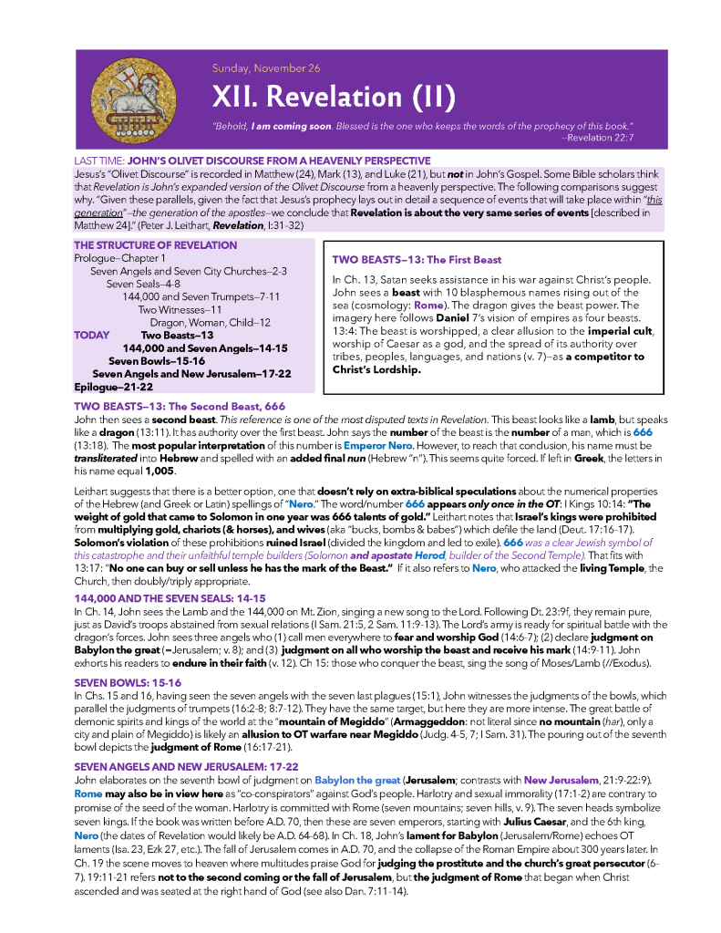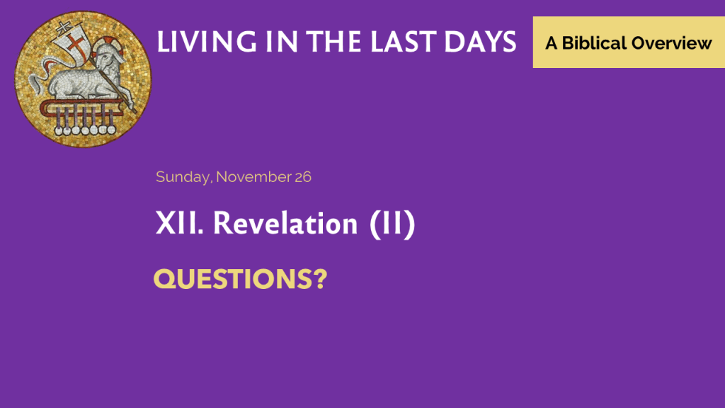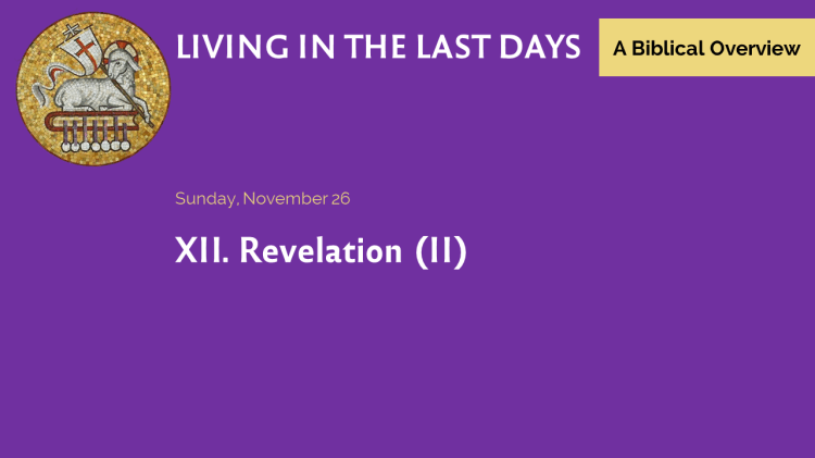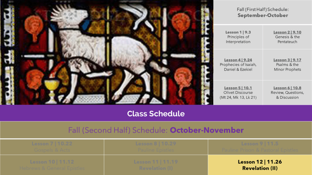 | Lesson 10 | 11.12 Hebrews & General Epistles | Lesson 11 | 11.19 Revelation (I) | Lesson 12 | 11.26 Revelation (II) |