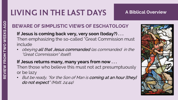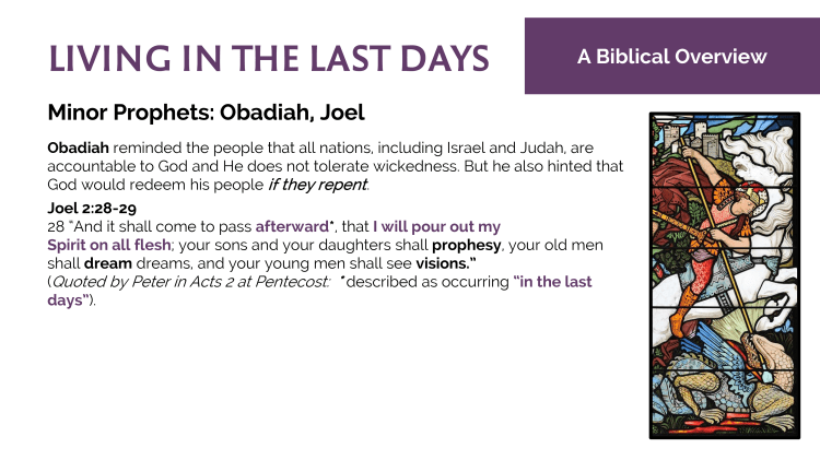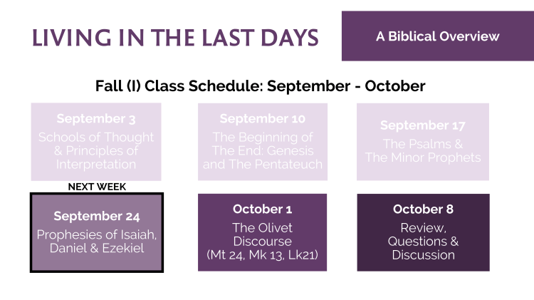 | Lesson 4 | 9.24 Prophecies of Isaiah, Daniel & Ezekiel | Lesson 5 | 10.1 Olivet Discourse (Mt. 24, Mk. 13, Lk. 21) | Lesson 6 | 10.8 Review, Questions, & Discussion |
