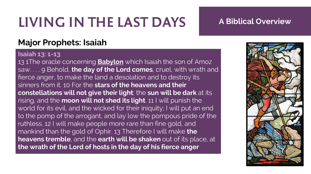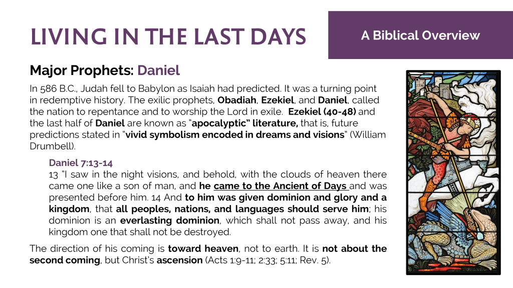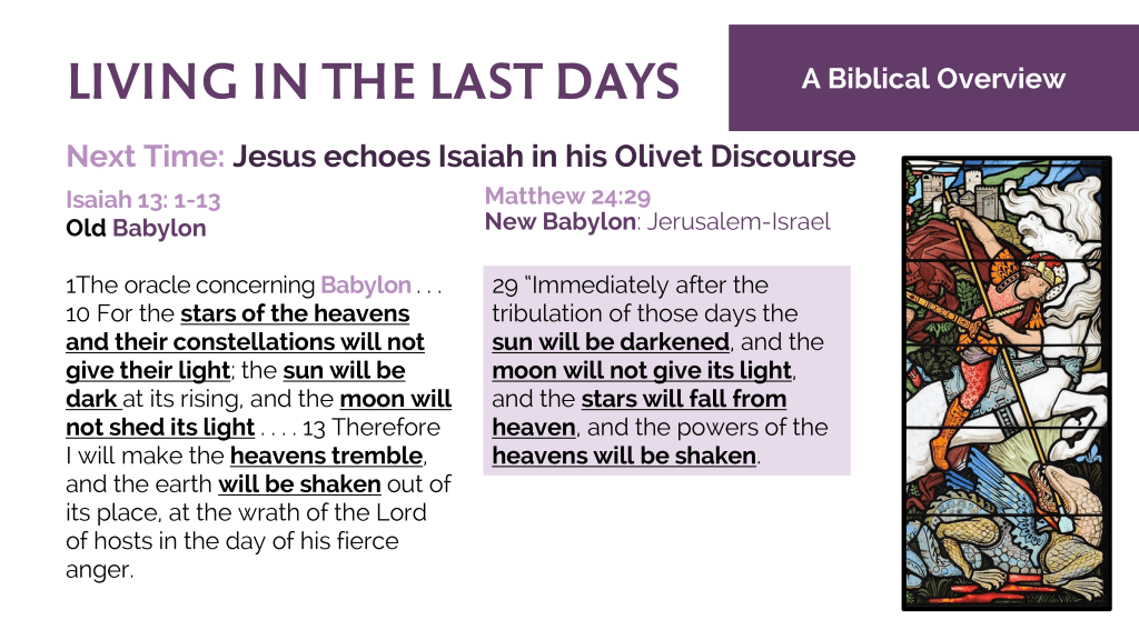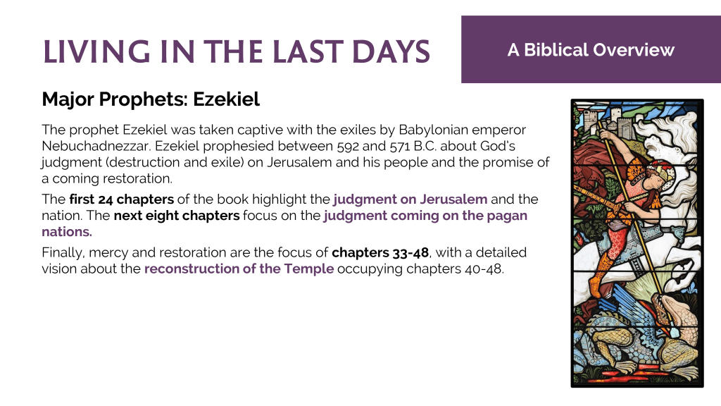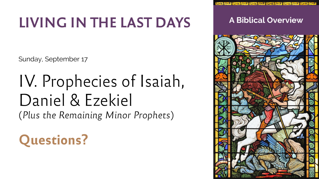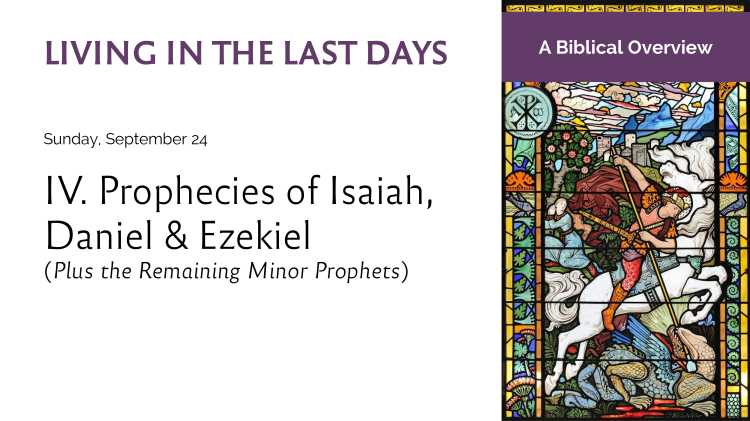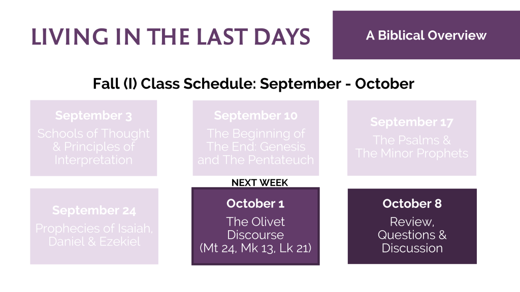 | Lesson 4 | 9.24 Prophecies of Isaiah, Daniel & Ezekiel | Lesson 5 | 10.1 Olivet Discourse (Mt. 24, Mk. 13, Lk. 21) | Lesson 6 | 10.8 Review, Questions, & Discussion |