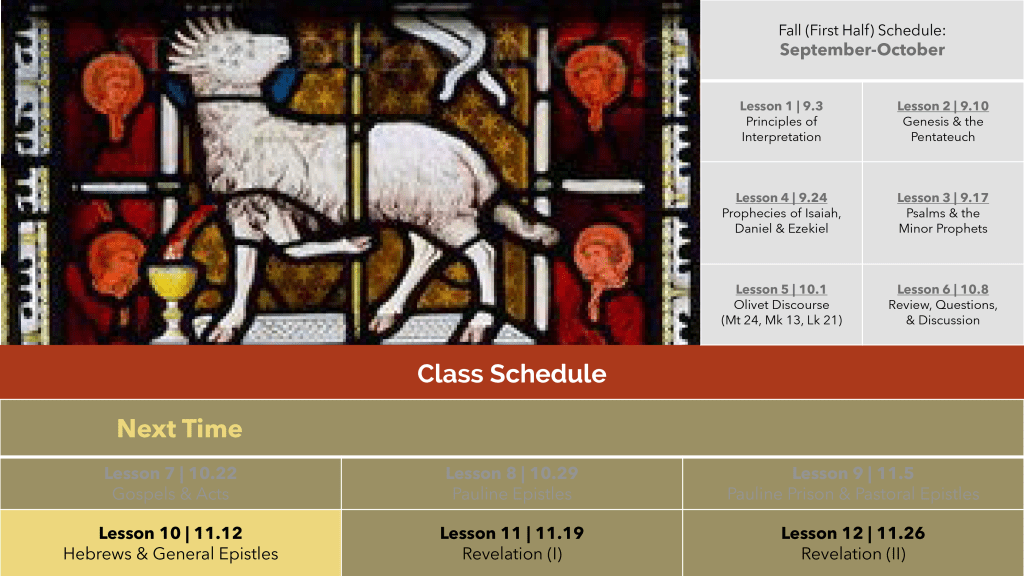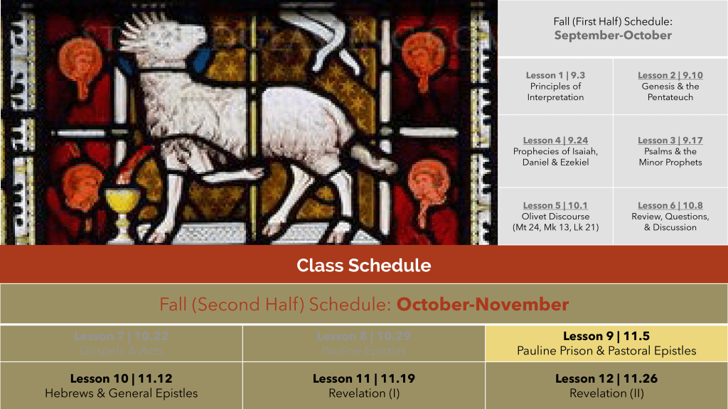 | Lesson 7 | 10.22 The Gospels & Acts | Lesson 8 | 10.29 Pauline Epistles | Lesson 9 | 11.5 Pauline Prison & Pastoral Epistles |
